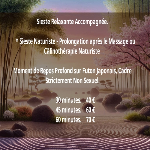 Parce que le corps a parfois besoin d'intégrer en douceur les bienfaits d'un massage, je vous propose un instant de sieste accompagnée, dans un cadre respectueux, sécurisant et Strictement non Sexuel (en cas de Tentative de geste Sexuel, la sieste s'arrête immédiatement et la séance n'est pas remboursée).